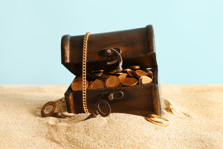 Old chest with treasures and keys on sand against blue background