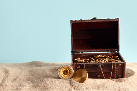 Old chest with treasures and compass on sand against blue background