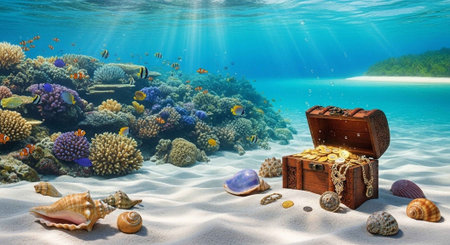 Treasure chest on the sand with corals and tropical fish underwater