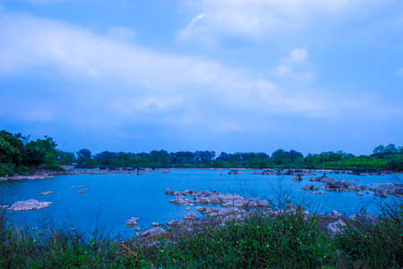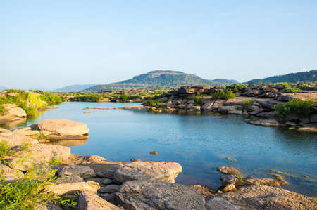 Sam Phan Bok, Ubon Ratchathani, Thailand. Dry rock reef in the Mekong River with mountain hills. Nature landscape background. Grand Canyon of Thailand.