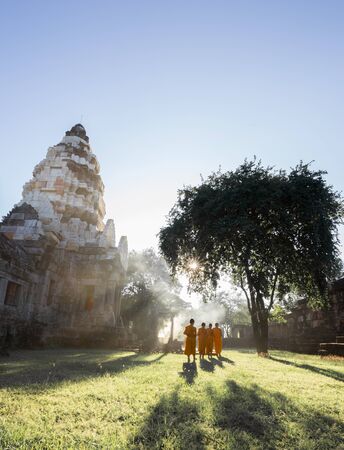 Unidentified Thai monks walking with sunlight at Phanomwan Historical Park in Nakhon Ratchasima, Thailand