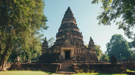 AI Generated. Ornate ancient temple entrance with carved stone facade stands majestically
