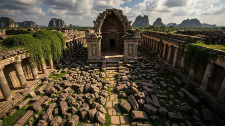 Lush showing ancient stone temple ruins overgrown with lush green ivy and surrounded by rugged mountainous landscape under a dramatic cloudy sky showcasing...