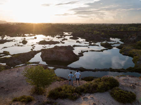 Bukit Mertajam, Penang/Malaysia - Jul 15 2019: Two people enjoy the magnificent view of lake at Guar Petai during sunset.