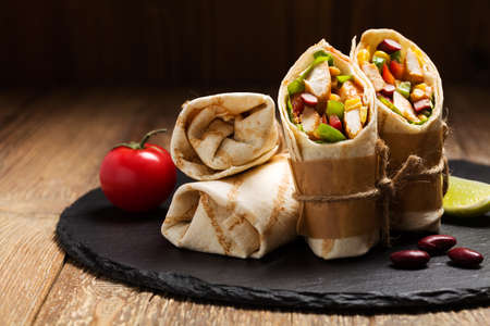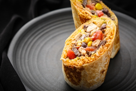Burritos wraps with beef and vegetables on dark wooden background. Beef burrito, mexican food.