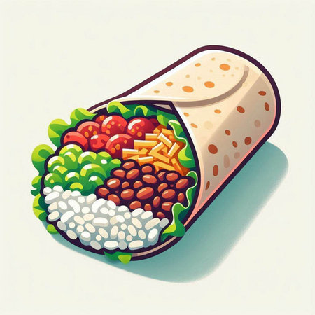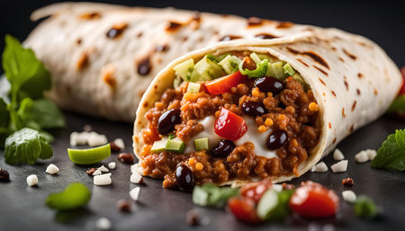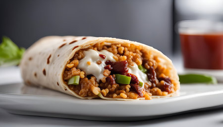 A close-up shot of a delicious burrito filled with ground beef, corn, and sour cream. The burrito is wrapped in a soft tortilla and is ready to be enjoyed.