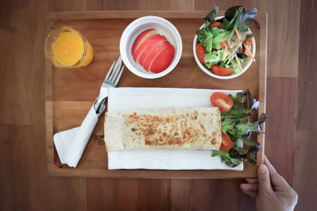 orange juice and taco ,vegetable roll or salad roll or burrito for serve