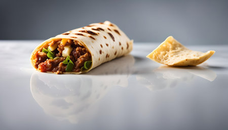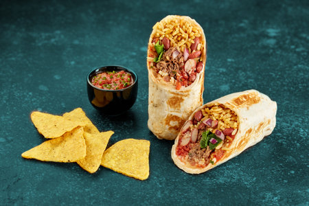 Traditional Mexican Beef Burrito with Nachos Chips and Salsa Sauce.
