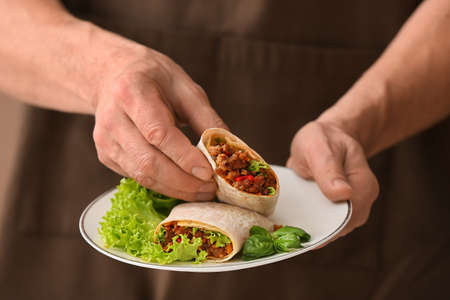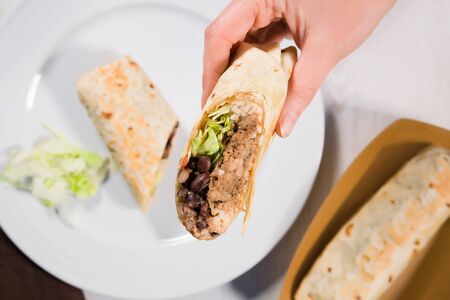 close up woman holding delicious burrito. High quality beautiful photo concept