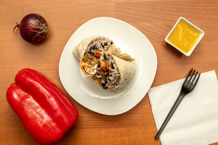Street fast Mexican food, freshly prepared, homemade sandwiches burrito with beans, beef, corn, peppers, tomatoes and herbs. On the wooden table, top view copy space