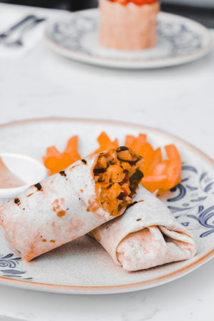 Vegetarian meat free mince filling tortilla wrap burrito with salad