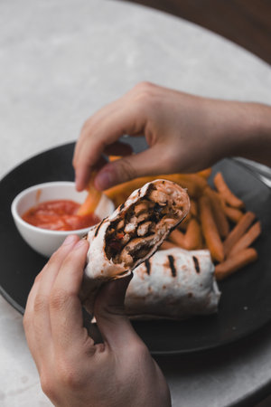 The process of cooking chicken wrap on kitchen table at home concept. Homemade kebab close up. Fresh thin lavash or pita bread roll of shawarma sandwich with ingredients inside.