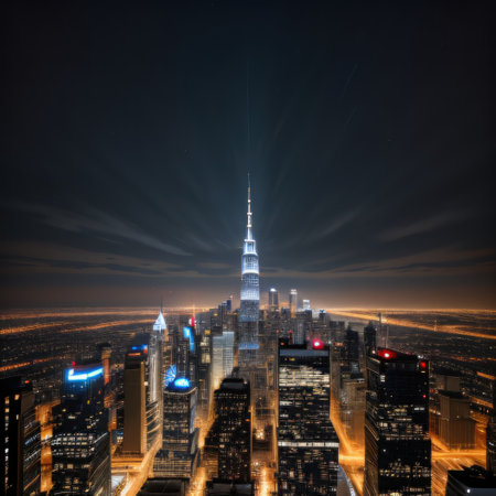 Futuristic skyscraper illuminates modern city skyline at reflecting success