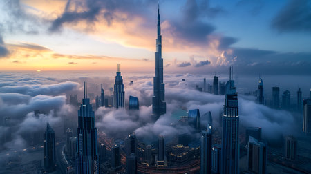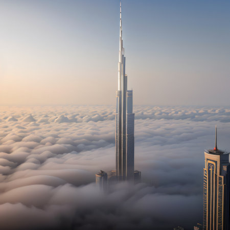 The majestic Burj Khalifa pierces through a veil of clouds, showcasing its architectural prowess and dominance over the Dubai skyline.