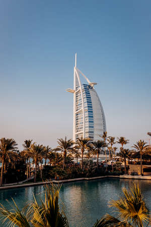 Dubai, UAE - November 04, 2021: The view of the Burj Al Arab hotel from Madinat Jumeirah in Dubai at sunset. Luxury modern architecture and tourism concept.