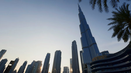 DUBAI, UAE - APRIL 5, 2020: Burj Khalifa tower at sunset in Dubai, United Arab Emirates