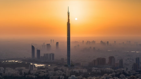 the sun setting over a city with tall buildings and skyscrapers in the fore - burn area, beijing, china. Generative Ai