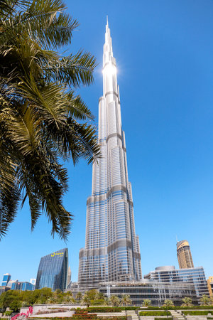 Dubai, UAE - January 6, 2020: Burj Khalifa towering against a clear blue sky in Dubai Downtown