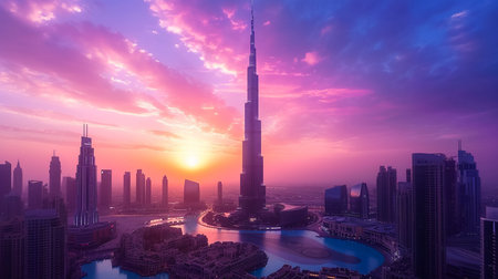 Generative AI Image of Burj Khalifa Tower Building Landscape with Lake River at Sunset Sunrise