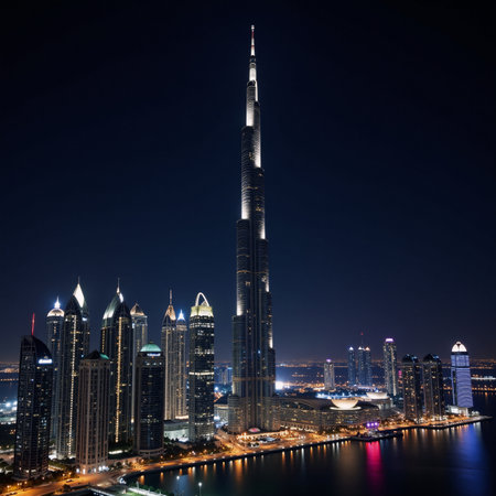 A striking view of Dubais futuristic architecture at night highlighting its luxury and modern charm