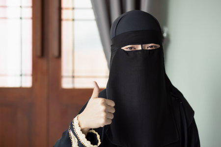 Middle Eastern Muslim woman with face covering veil pointing approval thumb up gesture