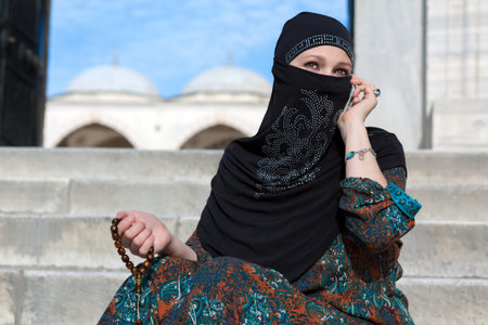 Outdoor Portrait of Lady talking on Telephone and holding Rosary in Traditional Islamic Clothing sitting at Marble Stairs of Mosque with Domes and Minarets Background