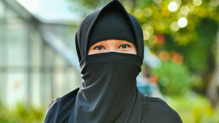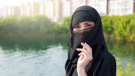 Portrait of young Muslim woman covering part of her face with characteristic Islamic veil. Close-upshot.