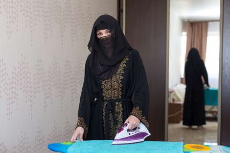 Muslim woman doing household chores ironing things.