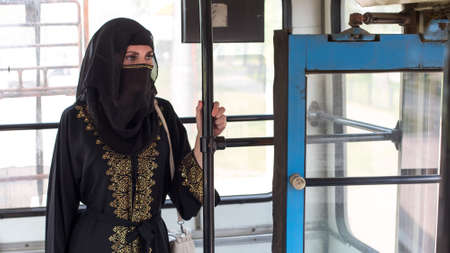 Muslim woman in national clothes rides around the city on public transport.