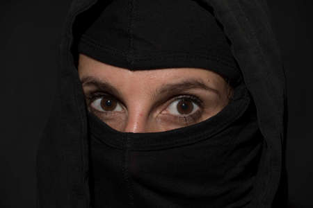 eyes of a young woman, face veiled in black clothing