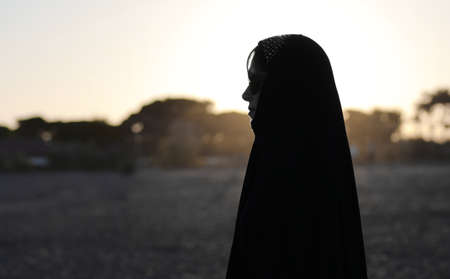 young arab woman with a typical black arabic dress in backlight in the desert