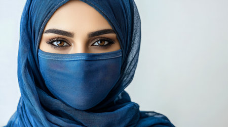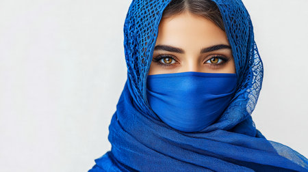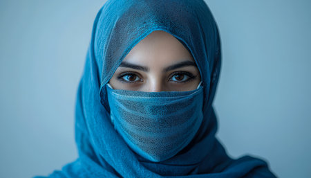 A woman gazes directly into the lens, wearing a vibrant blue headscarf and protective face covering, exuding confidence and serenity in natural light.