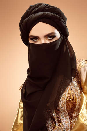 Oriental beauty woman. Portrait of a beautiful arabian woman in traditional look, with traditional oriental make-up and black hijab. Make-up and cosmetics.