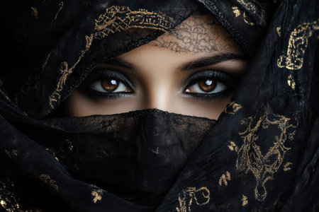 A woman draped in a black veil displays her striking brown eyes, highlighting her enigmatic presence and allure.