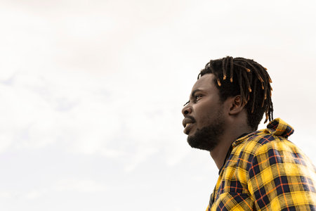 Stylish afro-american man with dreadlocks with meditative look and steel earing smiling on the background of sunset