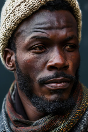 Close-up portrait of a handsome african man wearing a warm hat and scarf