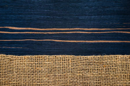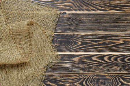 Copy space on a rustic textured wood tabletop painted with black paint and burlap of natural color on the side. Empty surface of textured wood planks and sackcloth. Top view.