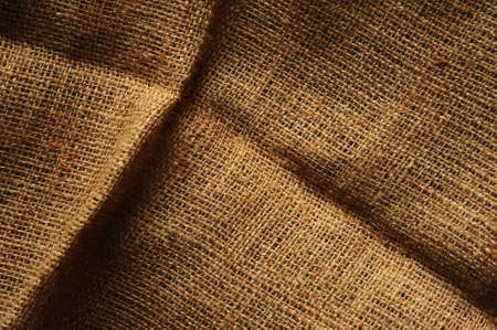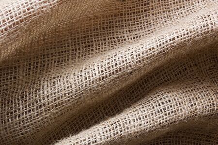 Crumpled brown sackcloth, an abstract background. Close up view on brown burlap textile. Texture of burlap fabric. Selective soft focus. Blurred background