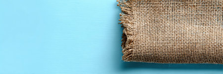 Burlap cloth showcases eco-friendly packaging on a bright sky-blue background, highlighting a commitment to sustainability and environmental awareness.