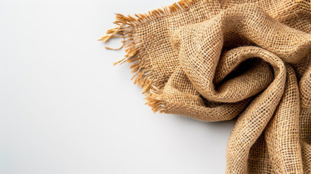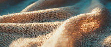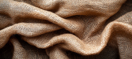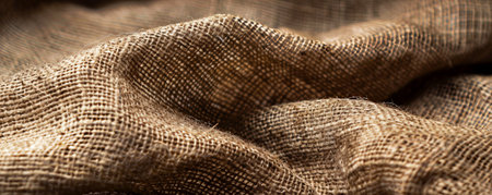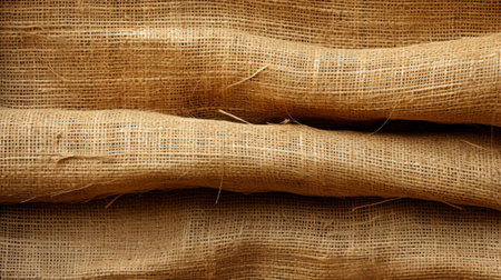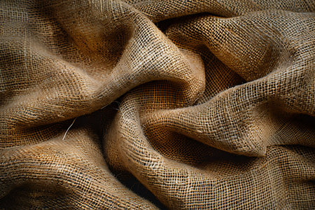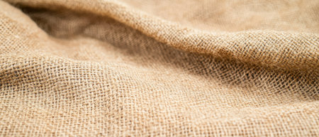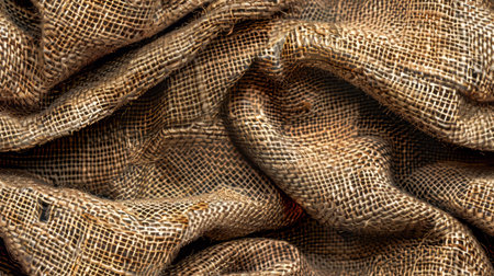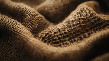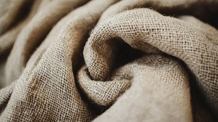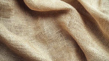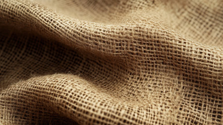 Textured burlap fabric draped softly with natural wrinkles, highlighting its earthy tones and tactile quality in soft light. Generative AI