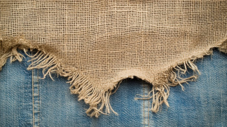 Close-up view of rustic burlap fabric draped over a textured denim background, showcasing natural tones and frayed edges, perfect for various design projects.
