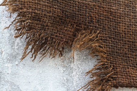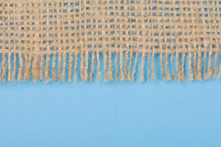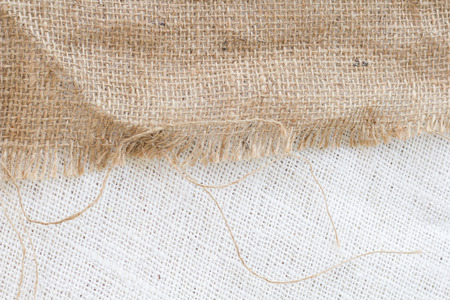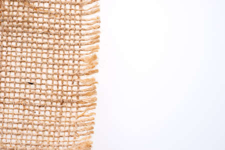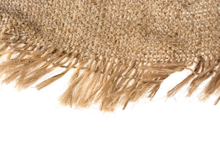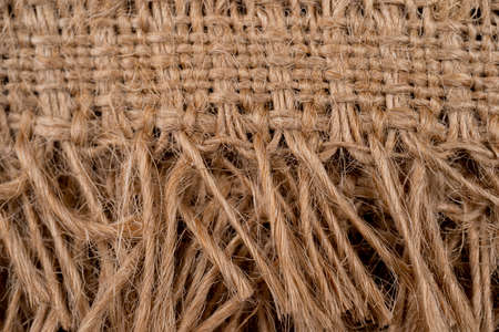 Piece of coarse hessian burlap textile used in making sacking and for rustic decor with a fringe with close up fibre texture detail