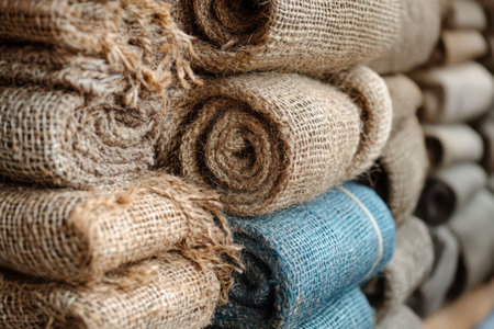 Rolls of burlap and woven fabric are stacked neatly showcasing various textures and colors in a craft store setting.