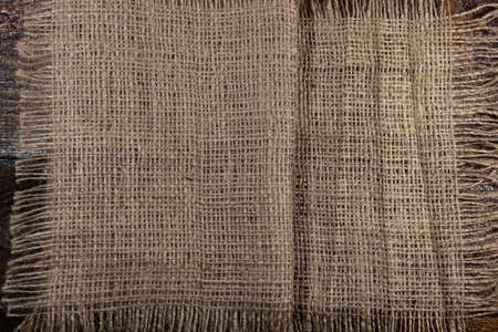 Background. Texture. A jute fabric with a fringe lies on a dark wooden background.