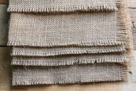 The burlap lies on the tabletop of a wooden table. Rough cloth on top of rough boards. top view
