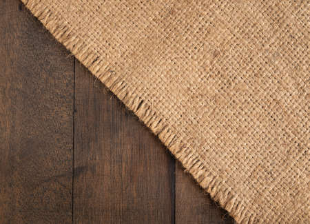 Sackcloth,burlap hessian arrange on wooden table background with copy space,top view