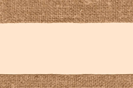 Burlap fabric with torn edges background. Macro texture of coarsely woven sackcloth of hemp, jute or flax. Rustic country style design element. Brown tan colored Ñanvas as craft material. Top view.