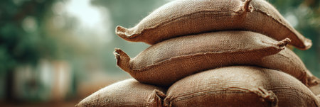 Stacked sandbags create a pyramid structure with a soft blurred background and gentle light, highlighting the texture of the burlap fabric.