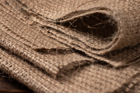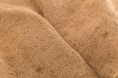 Close up view on brown burlap fabric. Crumpled sackcloth, abstract background. Texture of brown baline. Selective soft focus. Blurred background