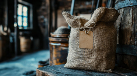 A rustic burlap sack with a blank paper tag tied at the top, placed in a vintage wooden setting with soft lighting.